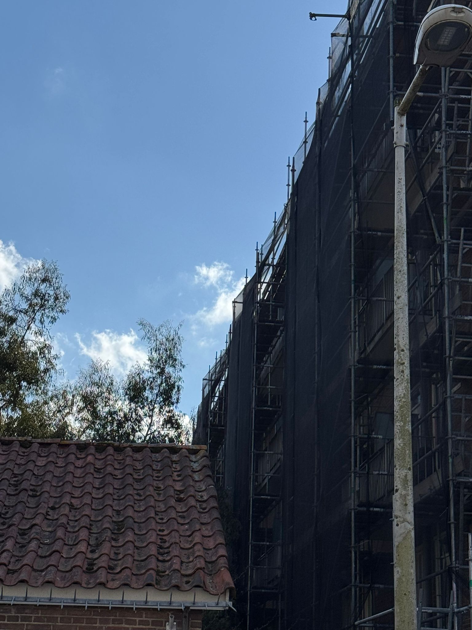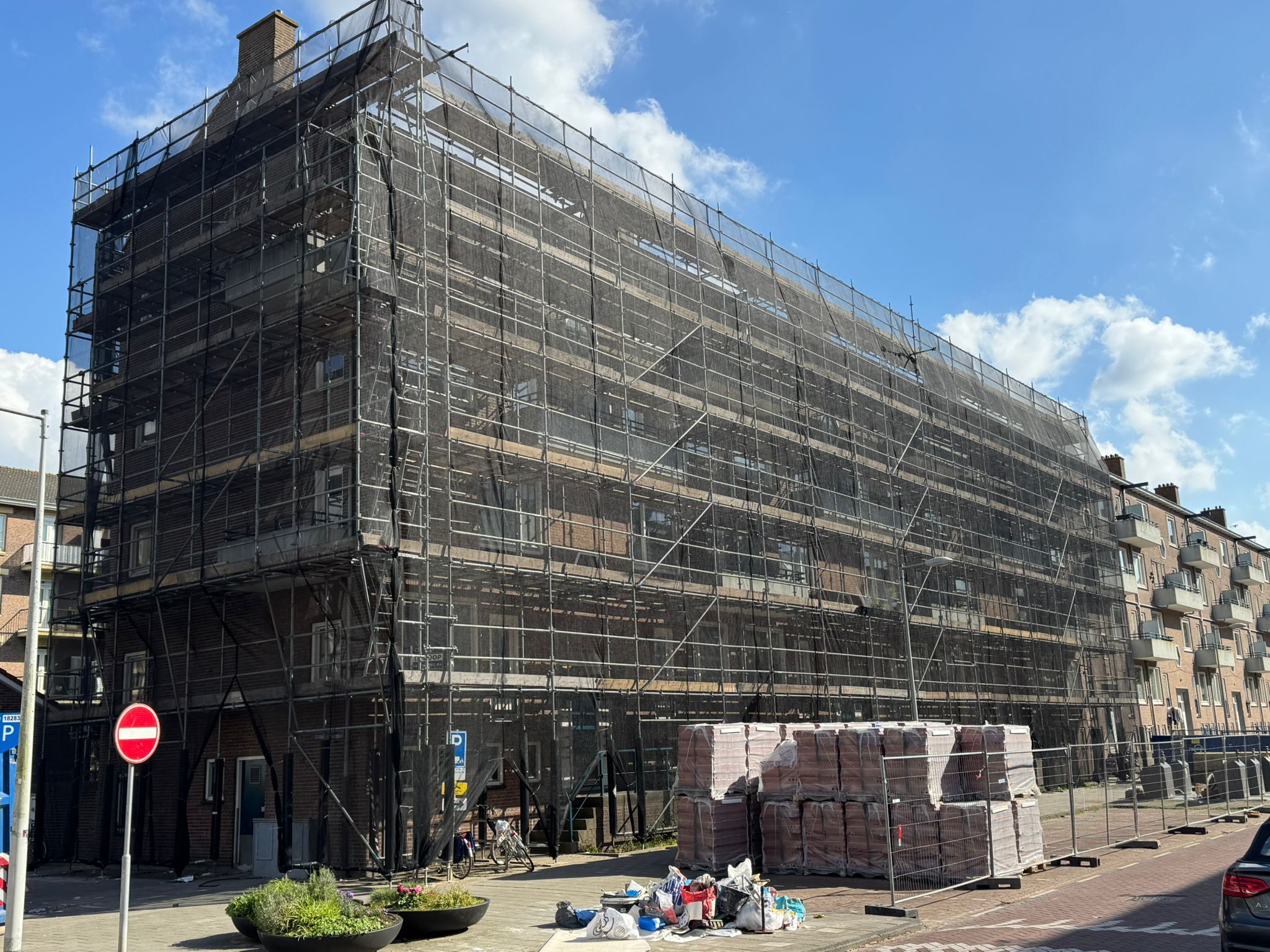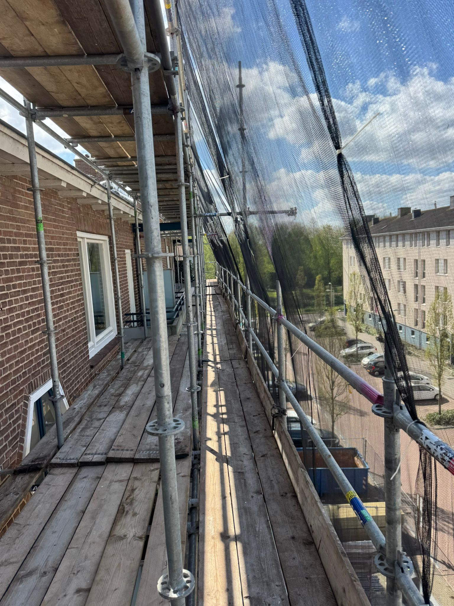 De voorgevel hebben wij van 750m2 steiger voorzien, de achtergevel 900m2