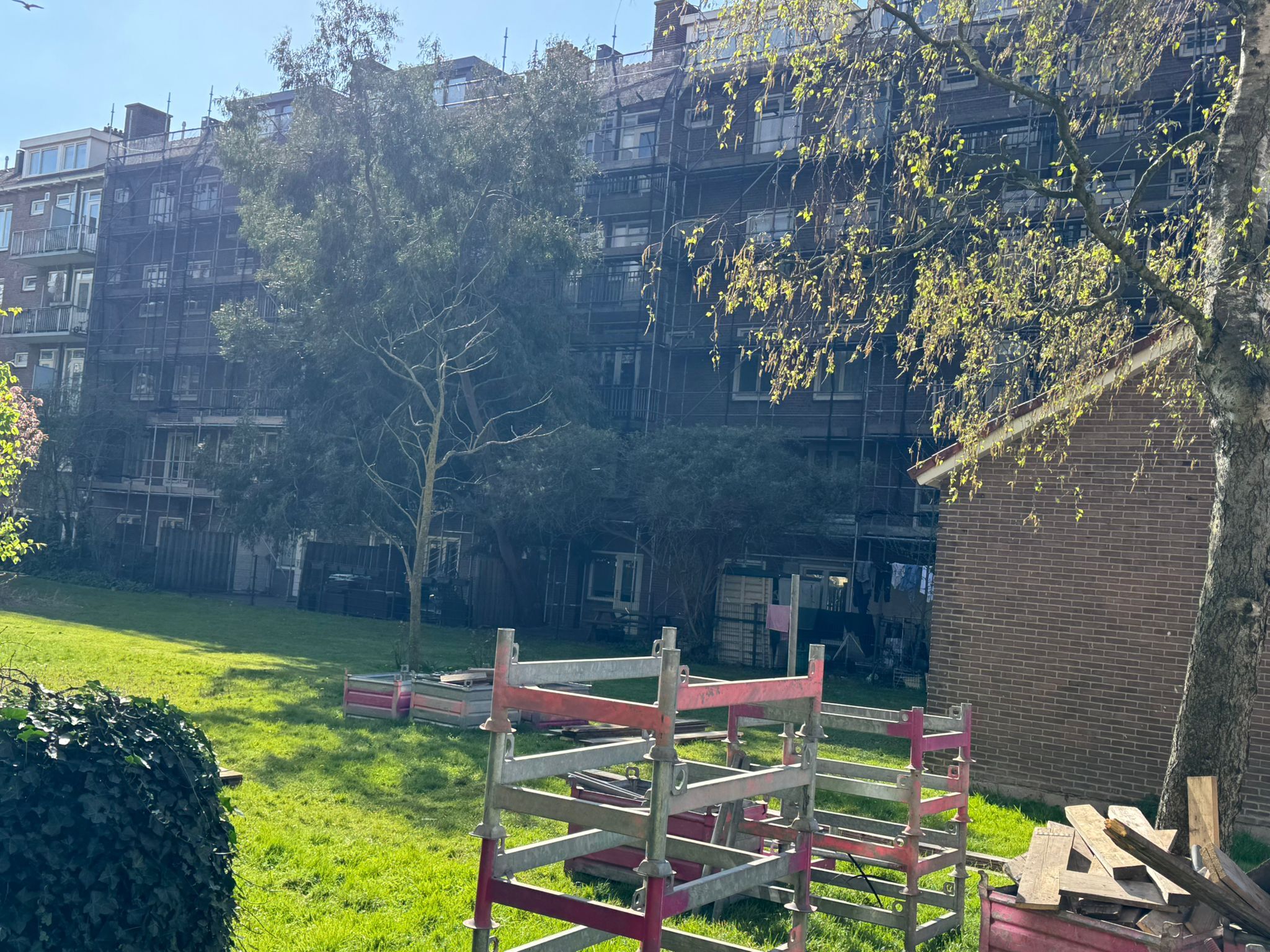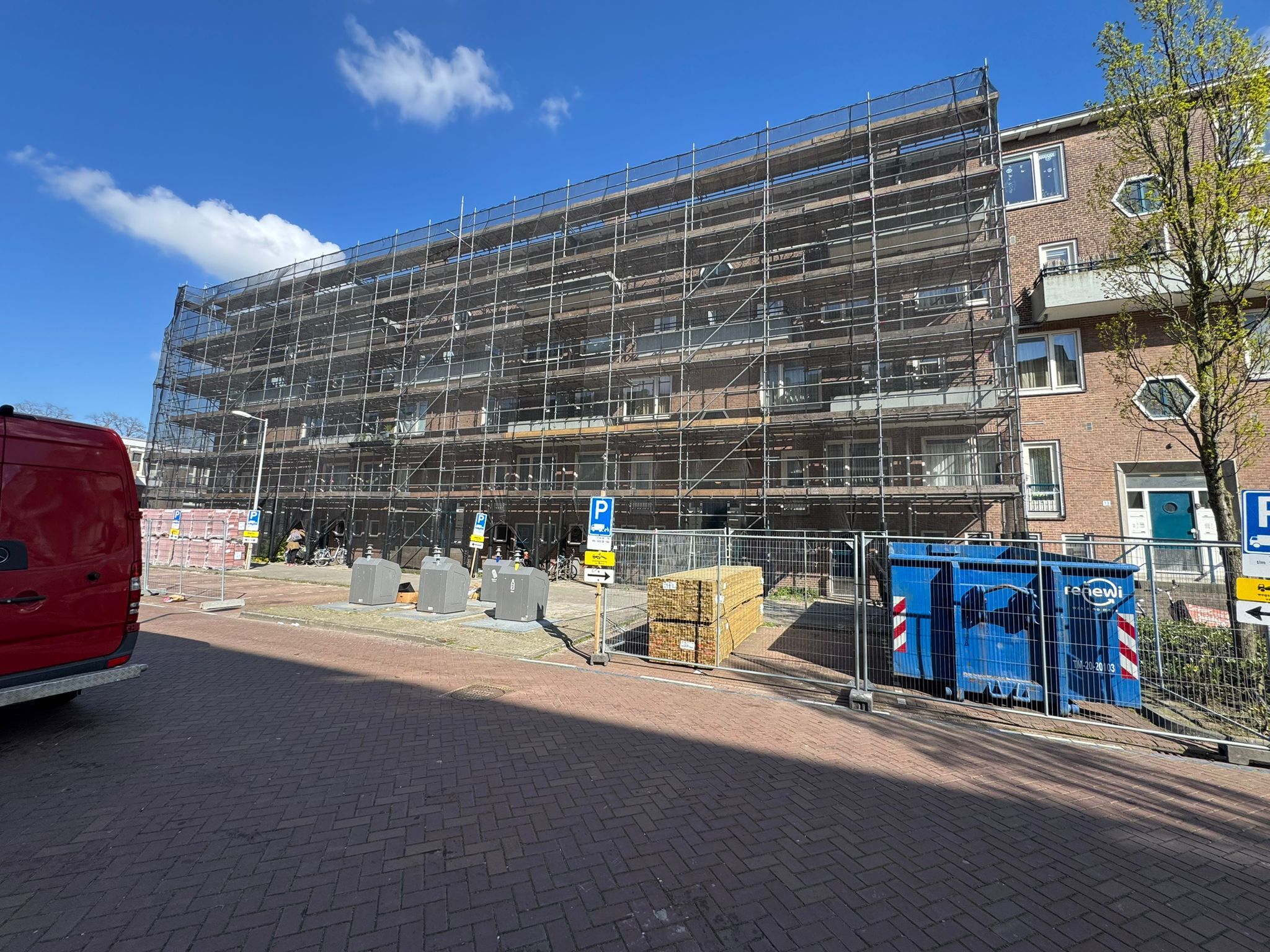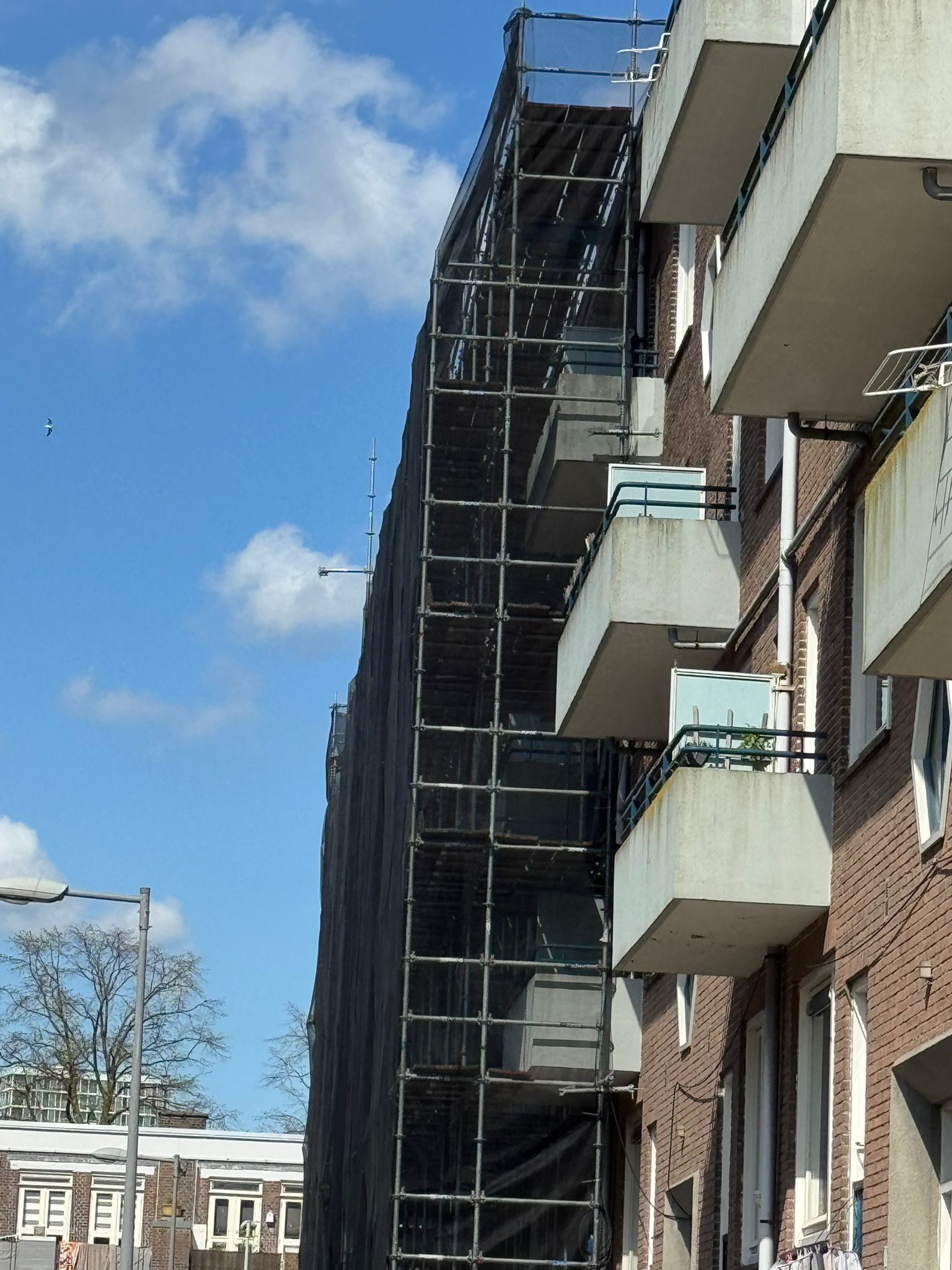 De voorgevel hebben wij van 750m2 steiger voorzien, de achtergevel 900m2